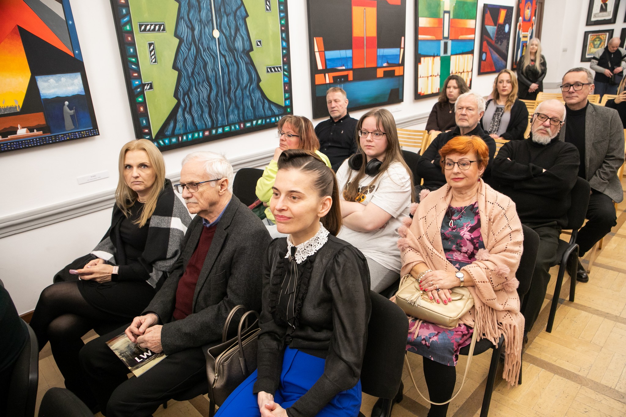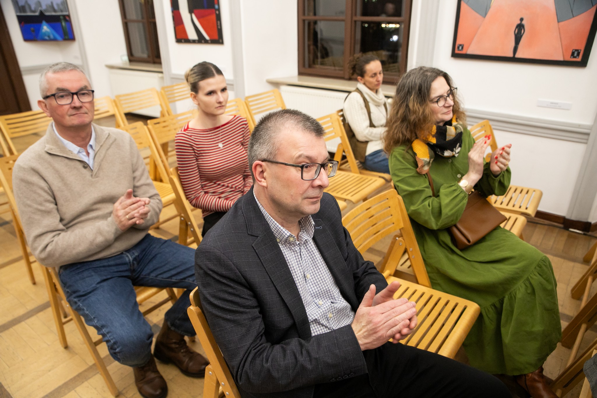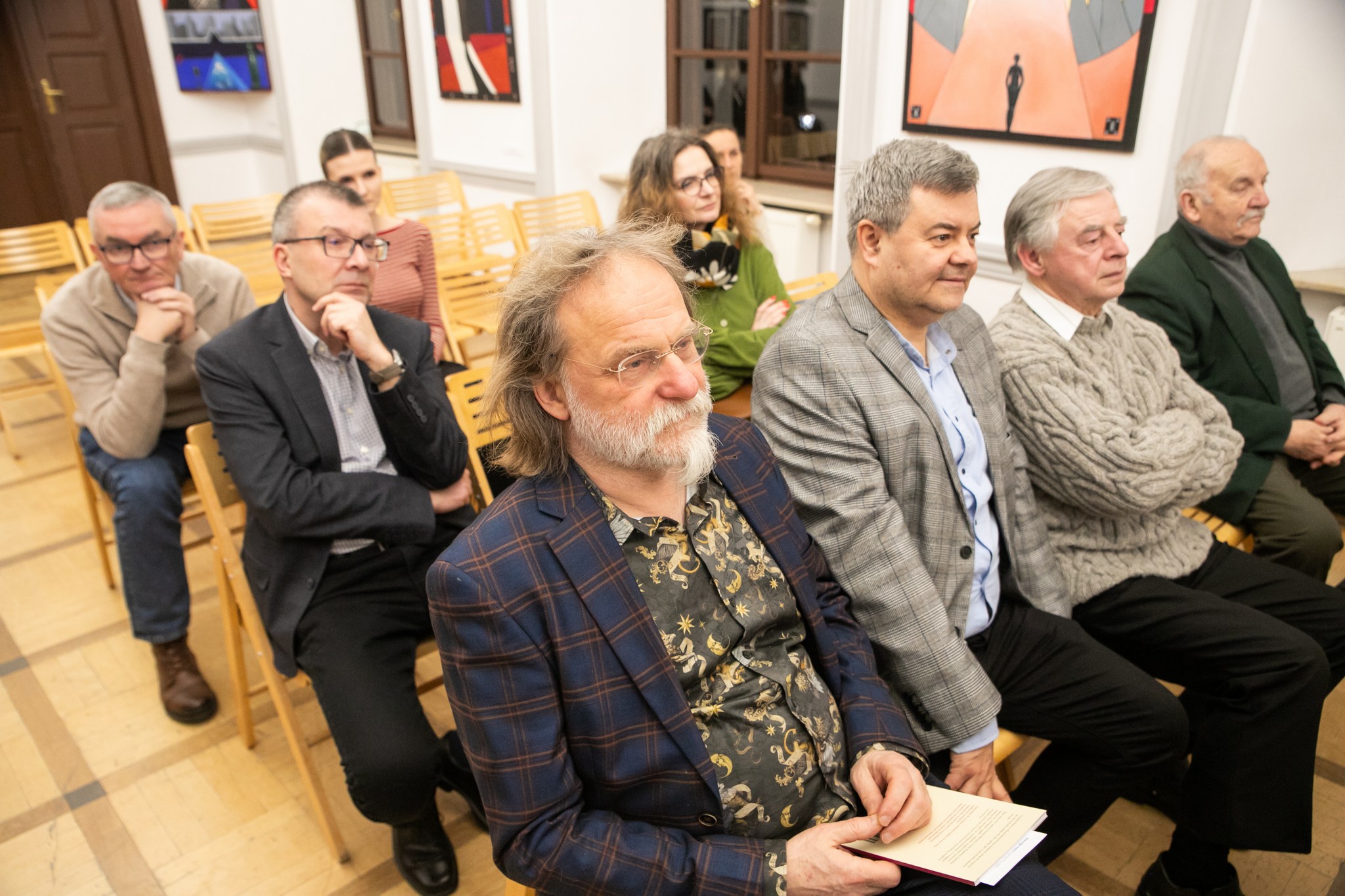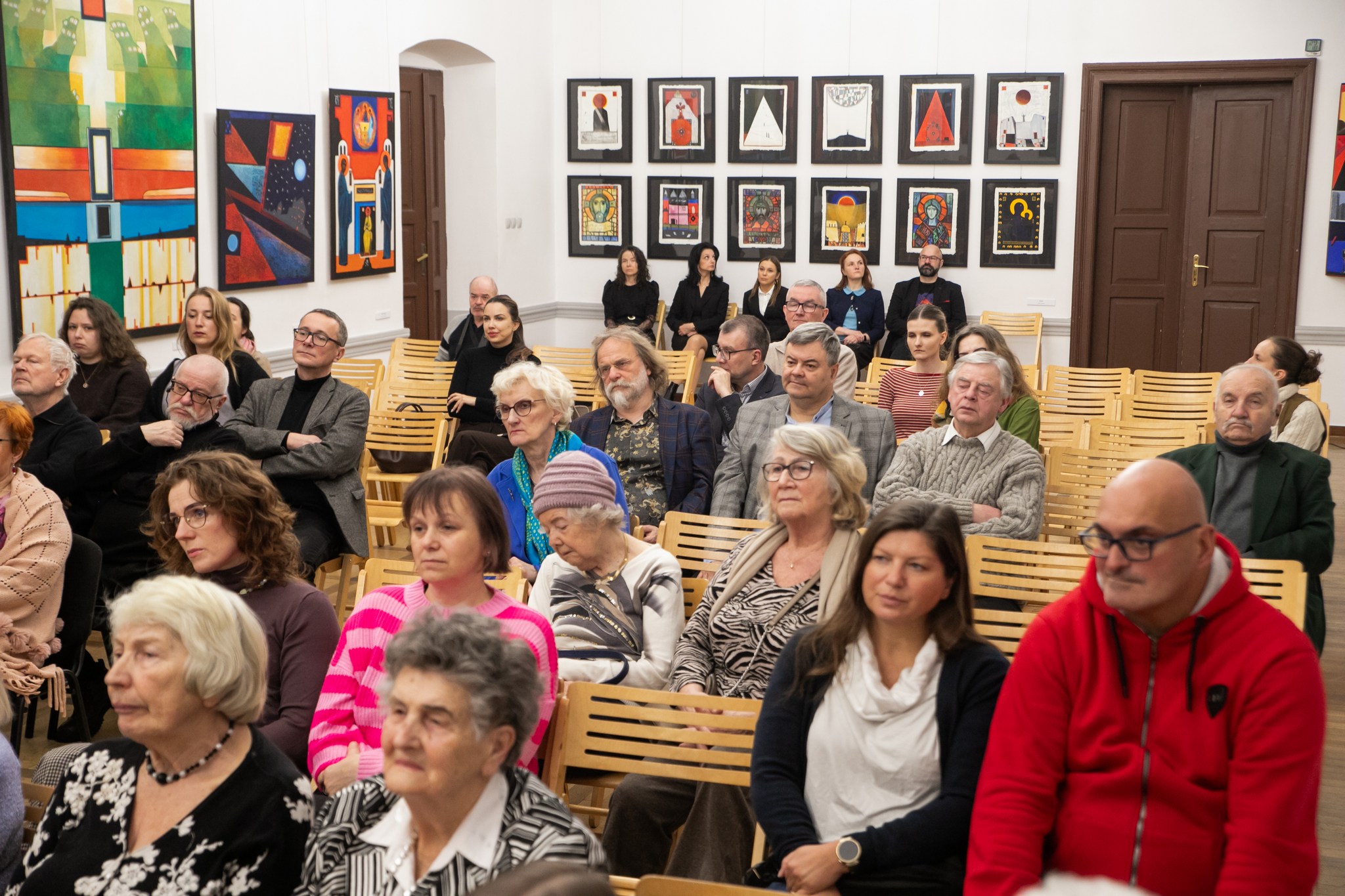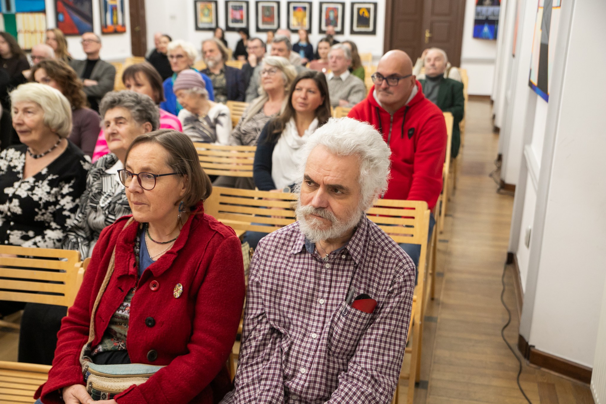 Bohaterem wieczoru był Michał Bogucki – malarz, performer, autor polichromii i witraży, a także znawca i twórca ikon. Artysta, urodzony w 1946 roku w Warszawie, jest absolwentem Akademii Sztuk Pięknych w Warszawie, gdzie studiował w pracowni prof. Stefana Gierowskiego. Jego twórczość od lat oscyluje wokół tematów duchowych, społecznych i egzystencjalnych, a kluczową rolę odgrywa w niej światło, rozumiane zarówno jako element malarski, jak i metafizyczny znak.