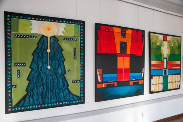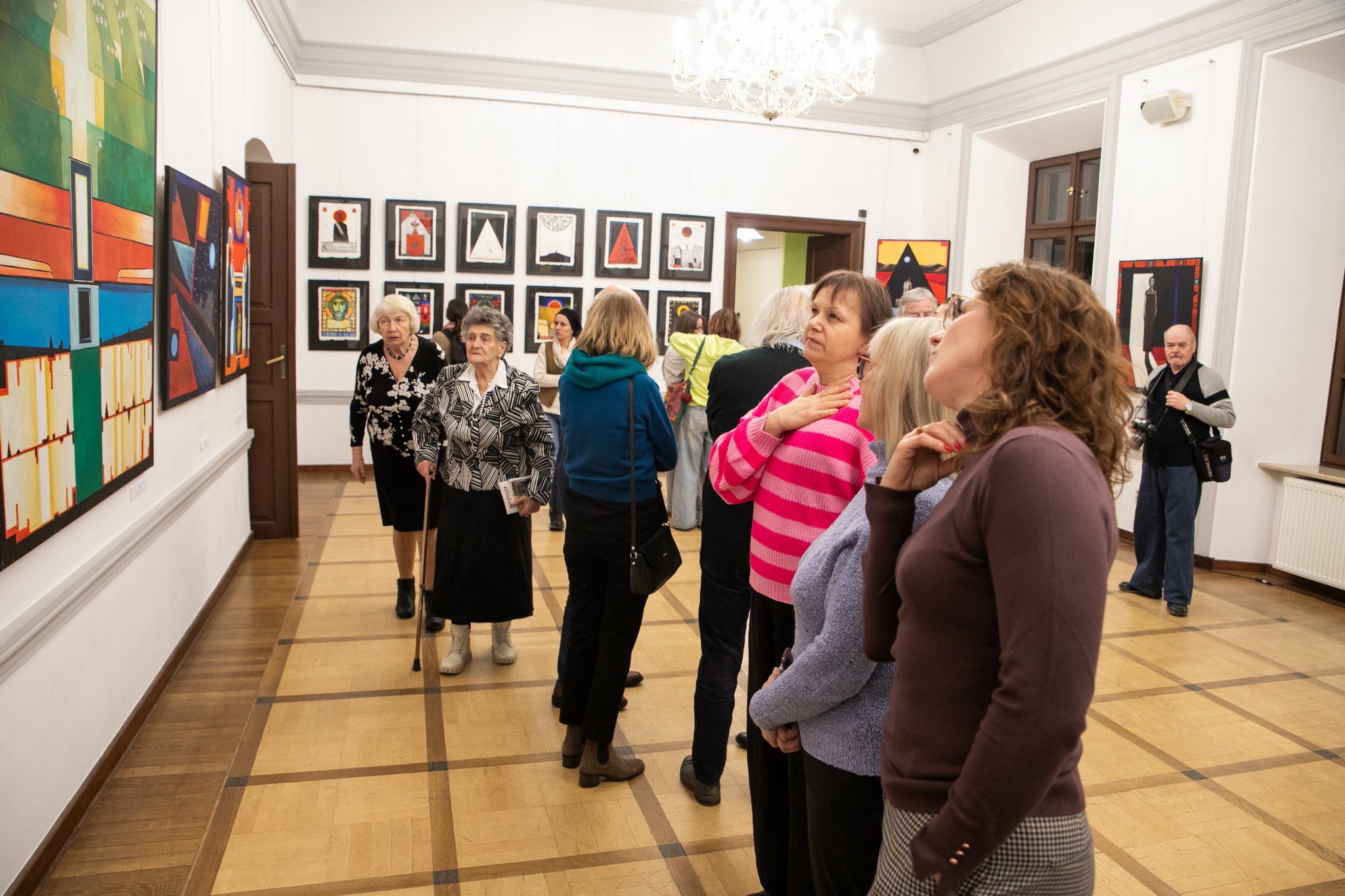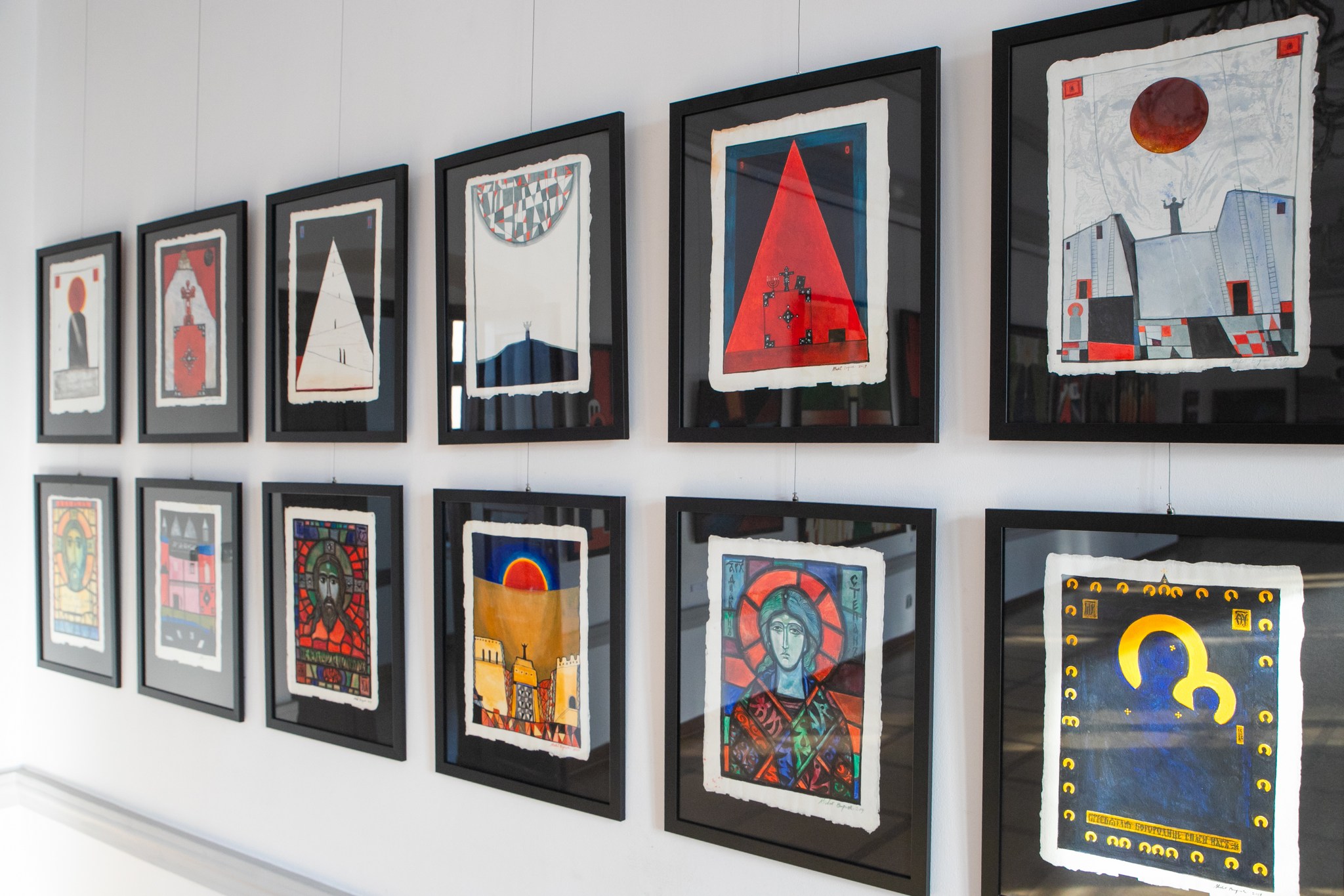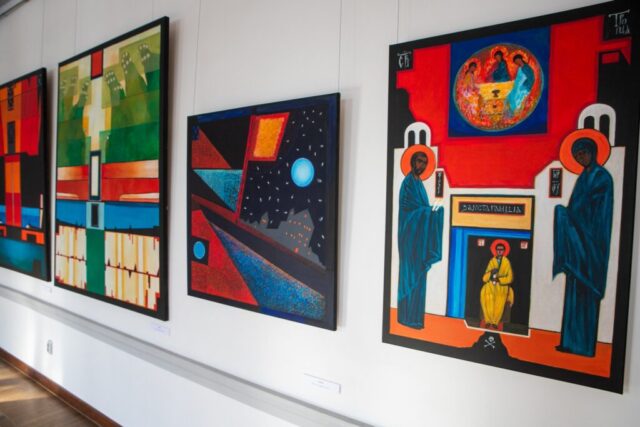 Na wystawie prezentowane są prace pochodzące z prywatnych zbiorów Joanny Dobosz Dobrowolskiej i Adama Dobosza, Ewy i Jarosława Majewskich oraz Agnieszki i Stanisława Miklasów. Ekspozycja obejmuje zarówno ikony, jak i obrazy abstrakcyjne z ostatnich lat, a także gwasze – projekty większych realizacji. Dominują barwne, geometryczne formy, intensywne czerwienie zestawione z czernią oraz wyraźna obecność symboliki chrześcijańskiej i ikonowej. W wielu pracach widoczne są również subtelne odniesienia do zbliżającego się okresu Wielkanocy.