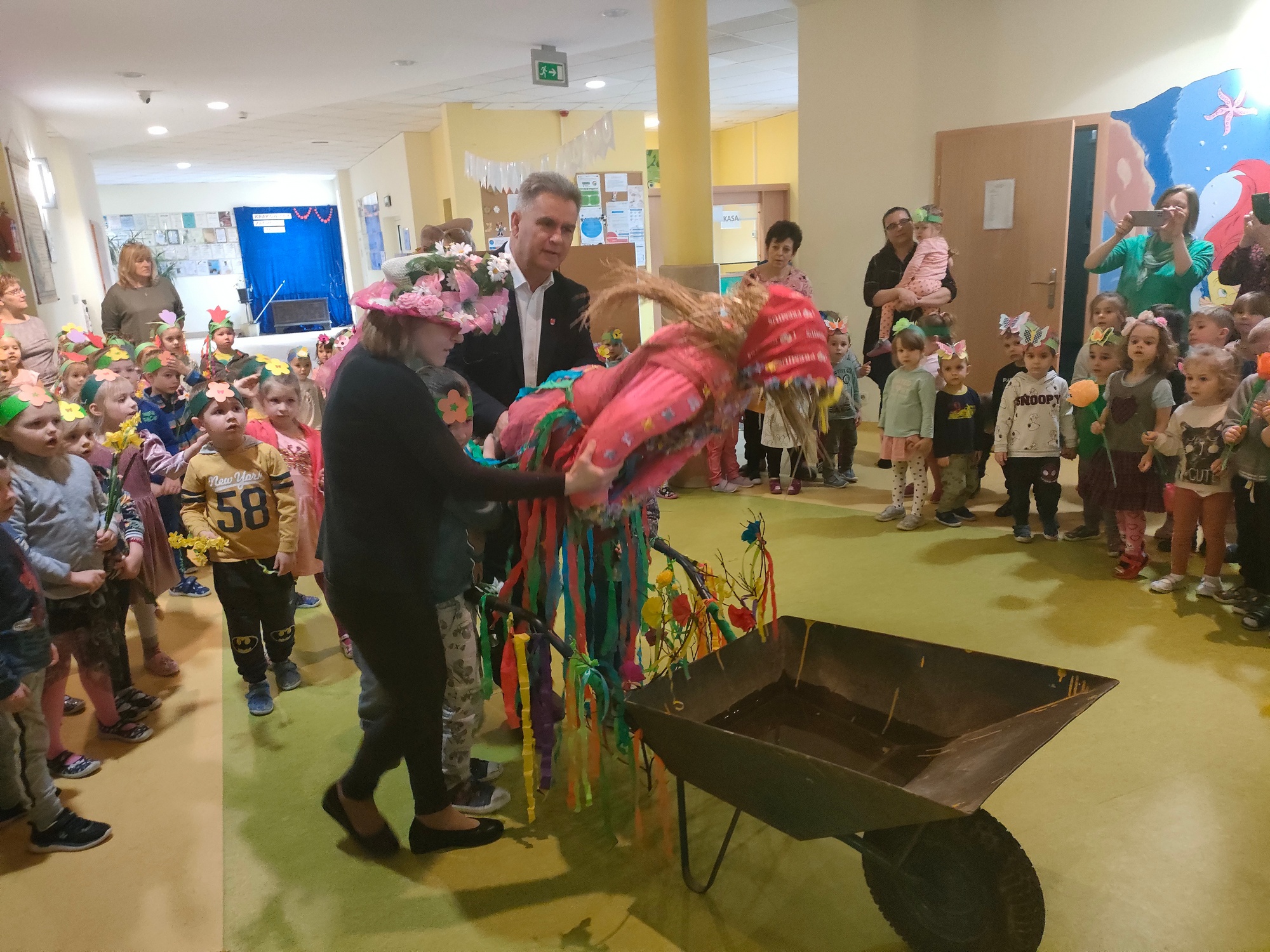 Tymi słowami przedszkolaki z Przedszkola Samorządowego w Krzeszowicach wraz z ważnym gościem burmistrzem Wacławem Gregorczykiem pożegnały zimę i powitały wiosnę. Do tego pięknego dnia dzieci przygotowywały się już wcześniej. Uczyły się piosenek, wierszy o wiośnie, wykonywały kolorowe kwietne opaski, gaiki przystrojone kwiatami a także przygotowały słomianą kukłę, która popłynąć miała Krzeszówką prosto do Bałtyku. Niestety pogoda spłatała przedszkolakom figla i z powodu deszczu dzieci świętowały w budynku przedszkola. Nie przeszkodziło to jednak w radości, jaką okazywały dzieci podczas topienia Marzanny w wielkiej ogrodowej taczce wypełnionej wodą. Pan Burmistrz wraz z kilkoma przedszkolakami utopił Zimową Pannę w wodzie by pożegnać chłodne i ponure dni a powitać ciepłą, kolorową i słoneczną wiosnę.
