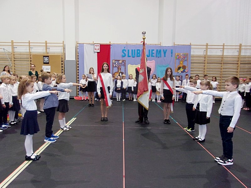 Pierwszy dzwonek dziś zadzwonił, W pierwszej klasie jestem już, W mojej szkole jest wesoło, Mam przyjaciół chyba stu.