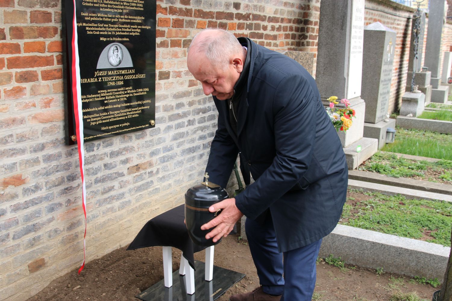 Redaktorzy Sławomir Iwanowski i Krzysztof Korbiel z pisma Polonii austriackiej „Polonika” podjęli starania o odnalezienie śladów grobu Ossolińskiego. Prowadzili rozmowy z archeologami, analizowali stare księgi cmentarne oraz plany kwater. Dzięki ich pracy udało się w przybliżeniu określić miejsce pochówku, skąd pobrano ziemię, złożoną następnie w symbolicznym grobie pod tablicą upamiętniającą wielkiego Polaka.