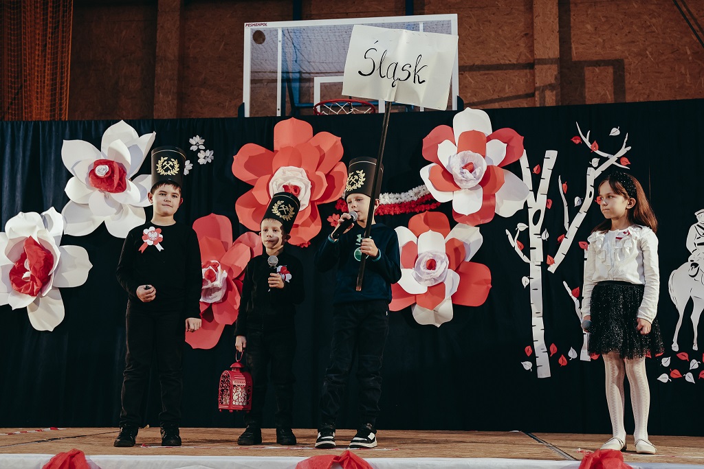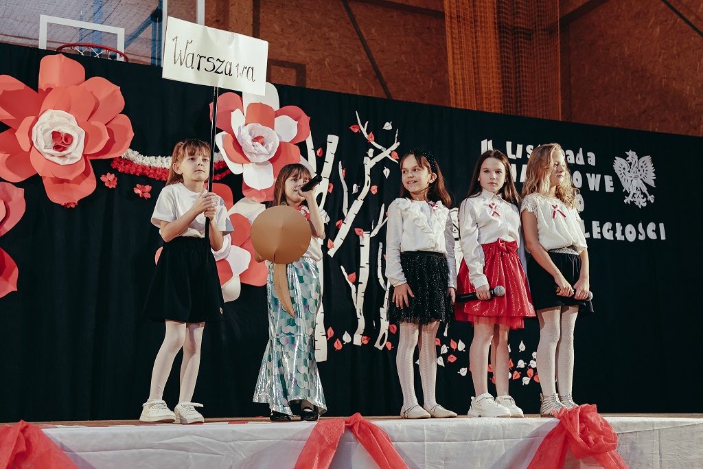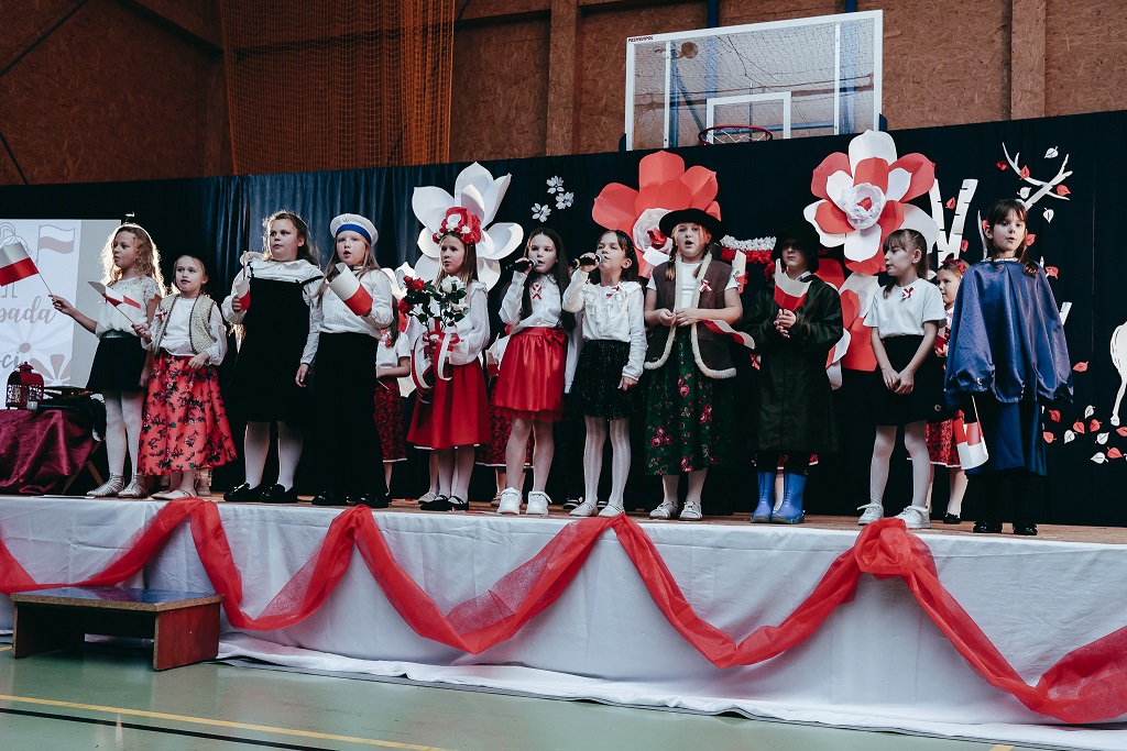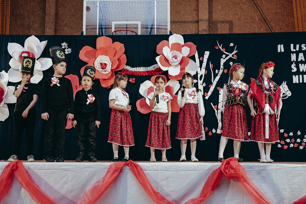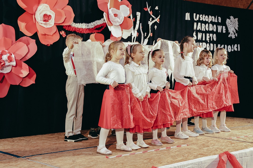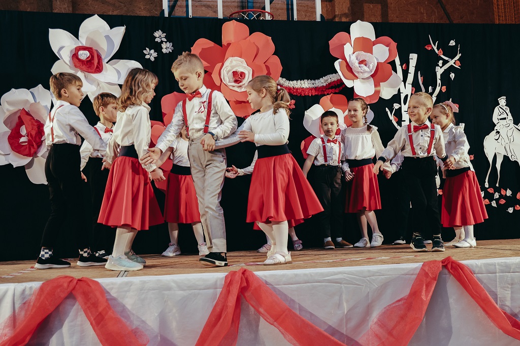 Pierwsza część wieczoru należała do najmłodszych. Przedszkolaki oraz uczniowie klas I–IV zaprezentowali barwne widowisko „malowane tańcem, piosenką i wierszem”. Ich radosny, pełen emocji występ udowodnił, że miłość do Ojczyzny można wyrażać na wiele sposobów – słowem, ruchem i uśmiechem.