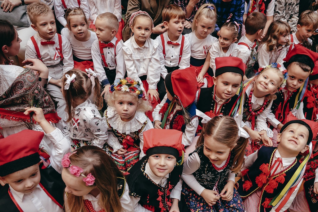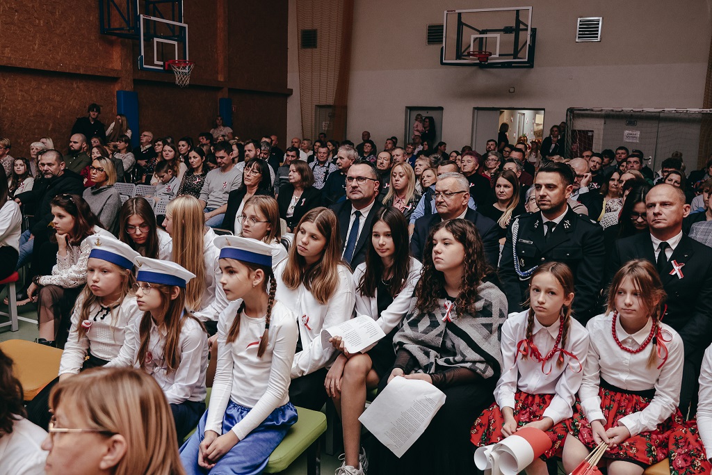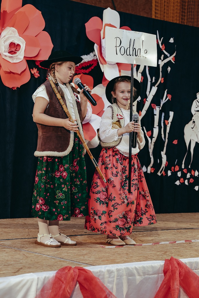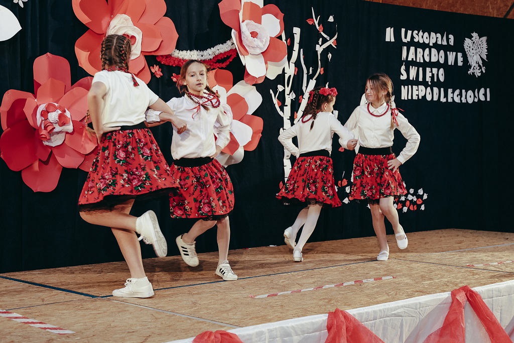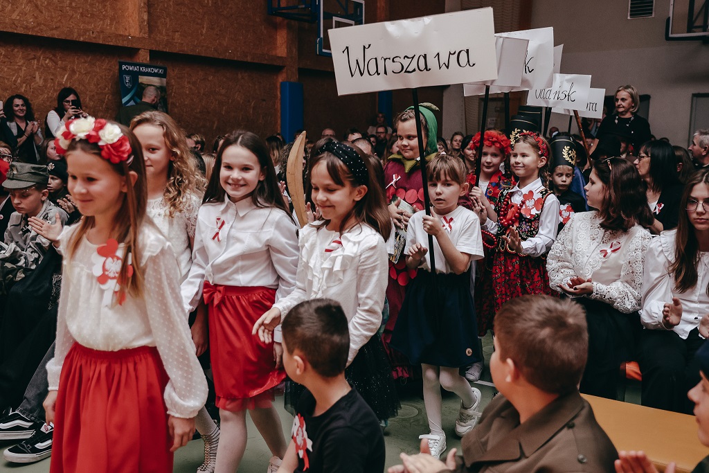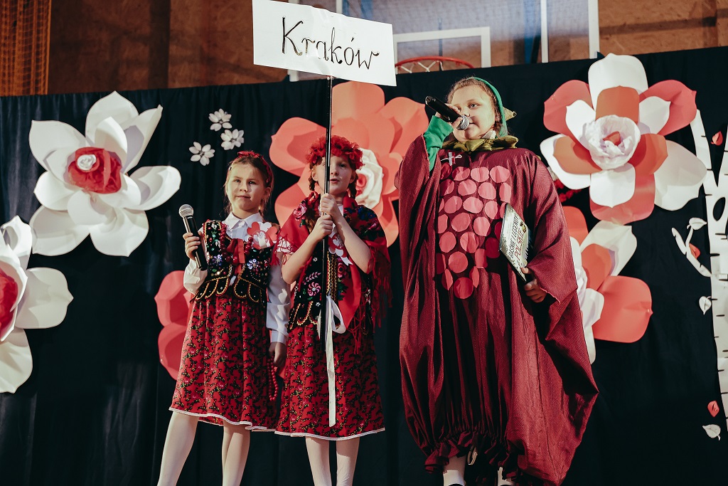 Pierwsza część wieczoru należała do najmłodszych. Przedszkolaki oraz uczniowie klas I–IV zaprezentowali barwne widowisko „malowane tańcem, piosenką i wierszem”. Ich radosny, pełen emocji występ udowodnił, że miłość do Ojczyzny można wyrażać na wiele sposobów – słowem, ruchem i uśmiechem.
