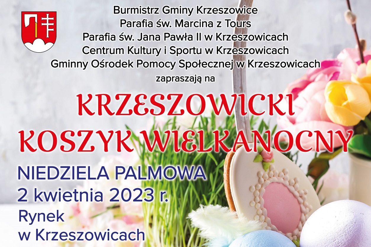 Burmistrz Gminy Krzeszowice, Parafia Św. Marcina z Tours, Parafia św. Jana Pawła II w Krzeszowicach, Centrum Kultury i Sportu w Krzeszowicach, Gminny Ośrodek Pomocy Społecznej w Krzeszowicach zapraszają na Krzeszowicki Koszyk Wielkanocny.